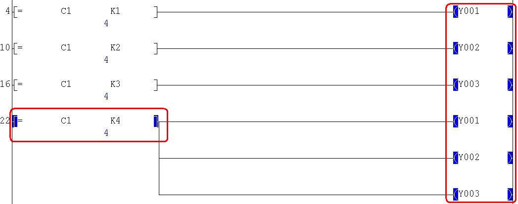 把C1 K6后邊的Y0-Y5去掉,改成輸出M0。在給上邊的Y0-Y5都并聯一個M0的常開觸點就沒有雙線圈了,功能也實現了。